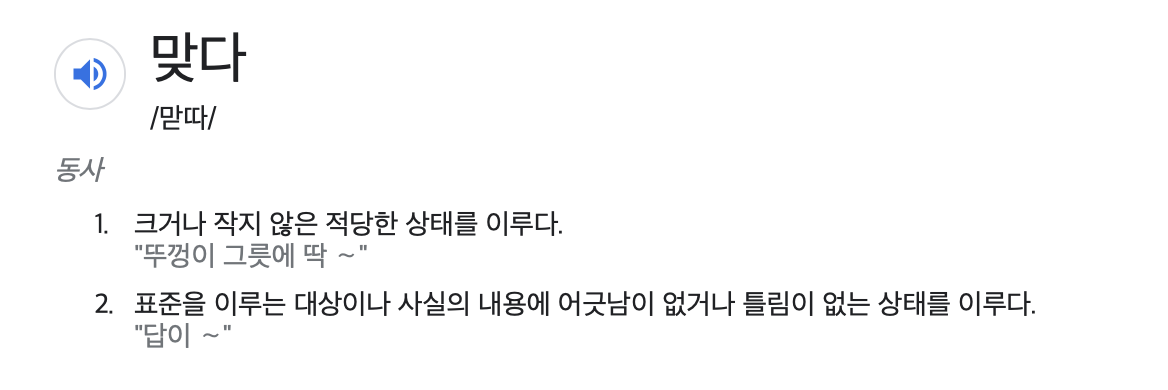 어긋남이나 틀림이 없는 상태를 이르는 말이고 크거나 작지 않은 알맞은 상태를 말할 때에도 맞다를 씁니다.