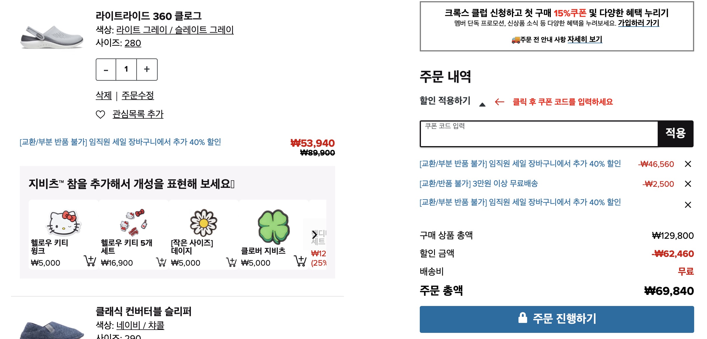 할인적용하기를 눌러서 쿠폰코드를 입력해서 적용한 상태여야 아래처럼 임직원세일 장바구니에서 추가 40% 할인을 적용받을 수 있다. 이 쿠폰 입력 없이 그냥 주문 진행을 하면 제값을 주고 구매하는거니 반드시 주의바람.